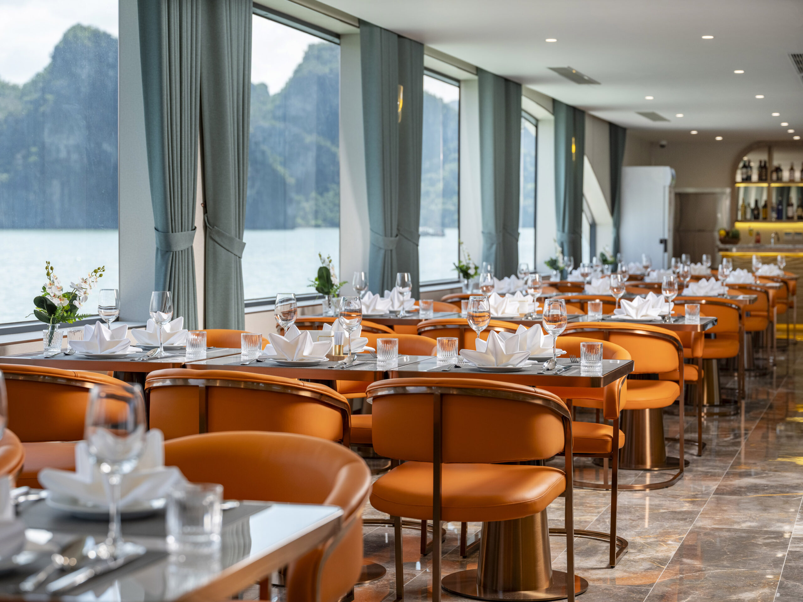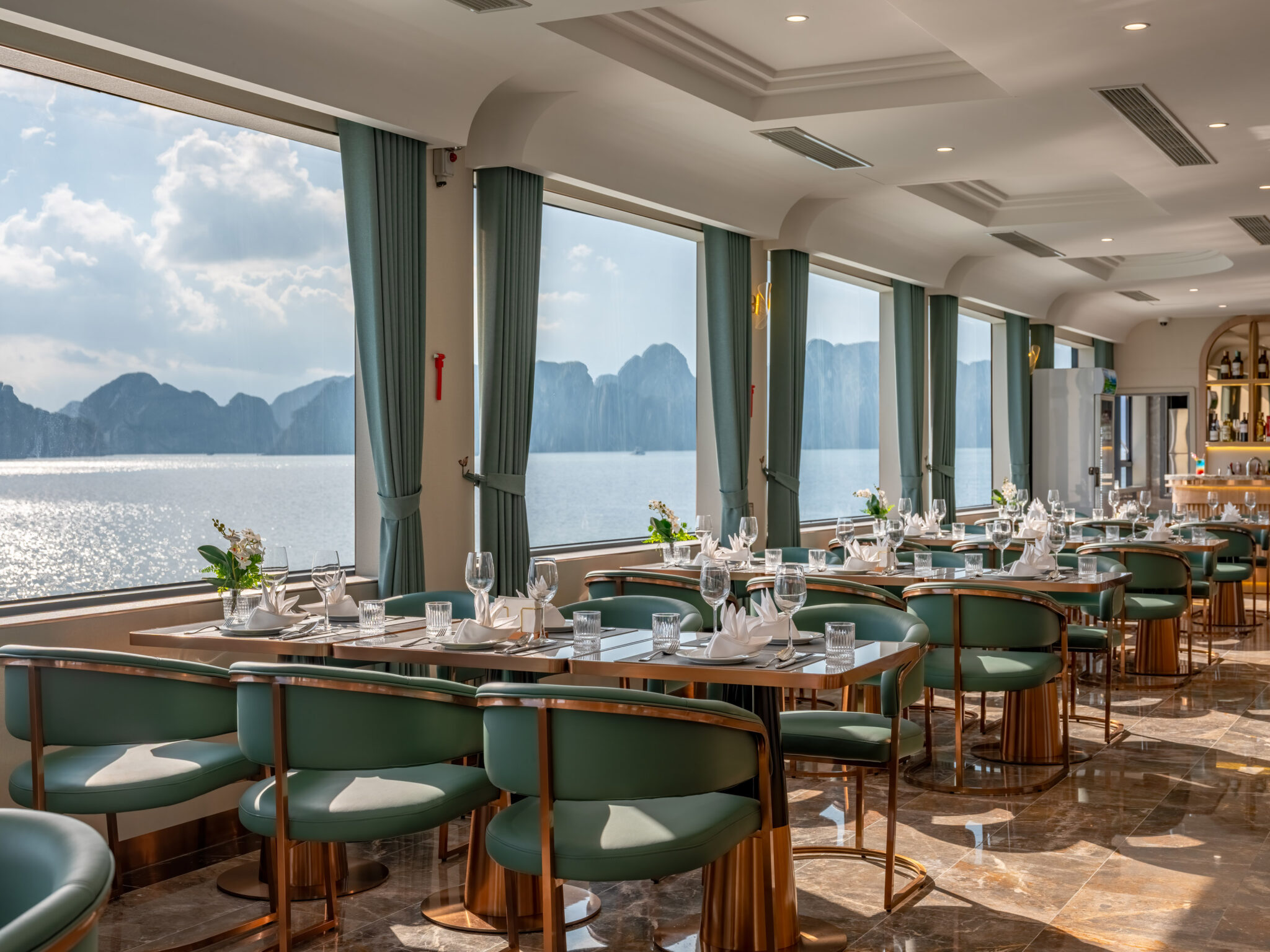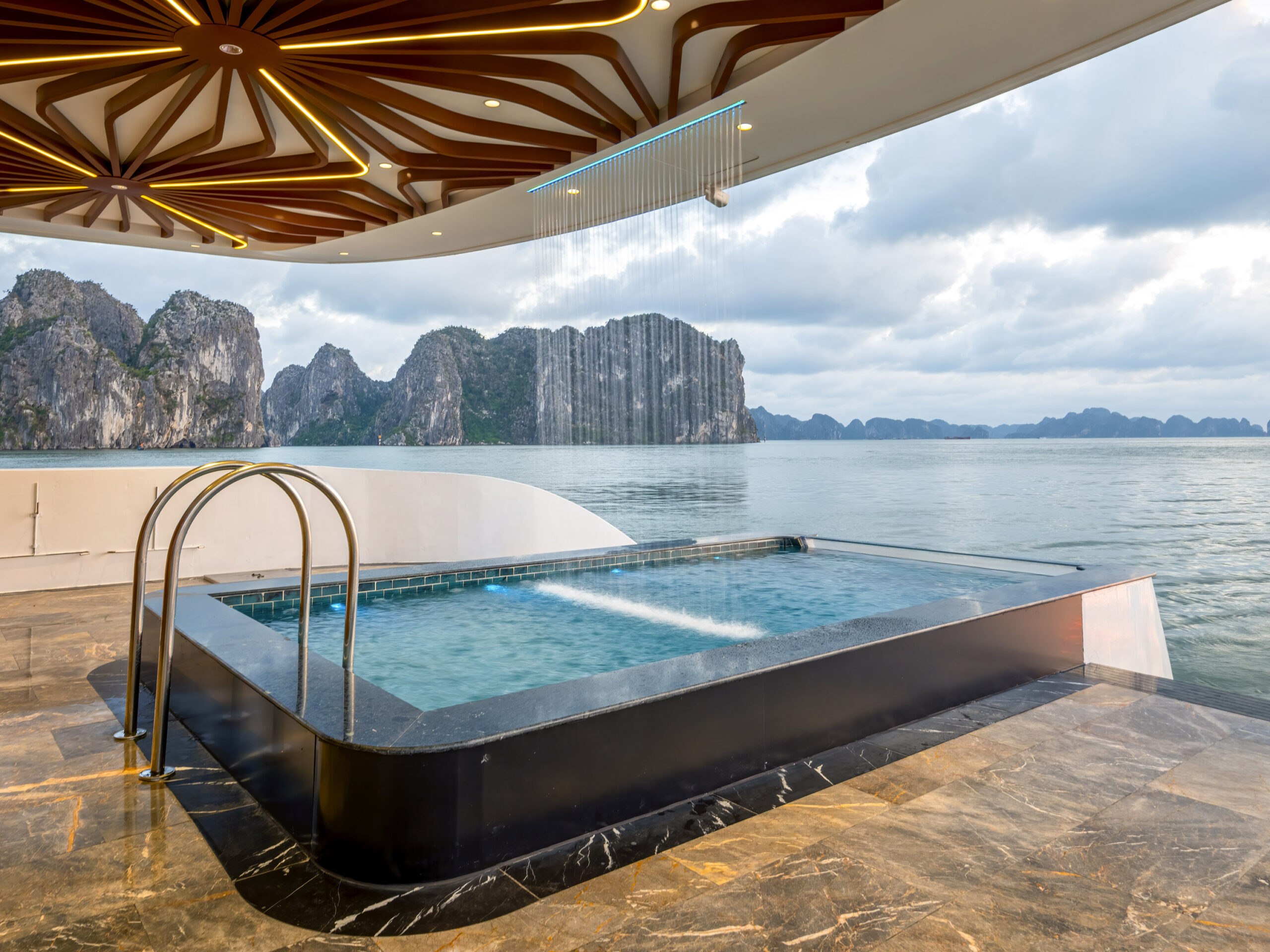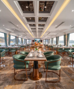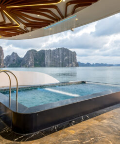 Du thuyền sở hữu không gian mở sang trọng: 2 tầng nhà hàng, quầy bar, sundeck ngắm hoàng hôn, bể bơi vô cực, cùng spa thư giãn và phòng gym tiện nghi. Với nội thất hiện đại và tầm nhìn hướng biển mang đến cho du khách trải nghiệm nghỉ dưỡng chuẩn resort giữa đại dương, hòa mình trọn vẹn vào khung cảnh nên thơ của vịnh.