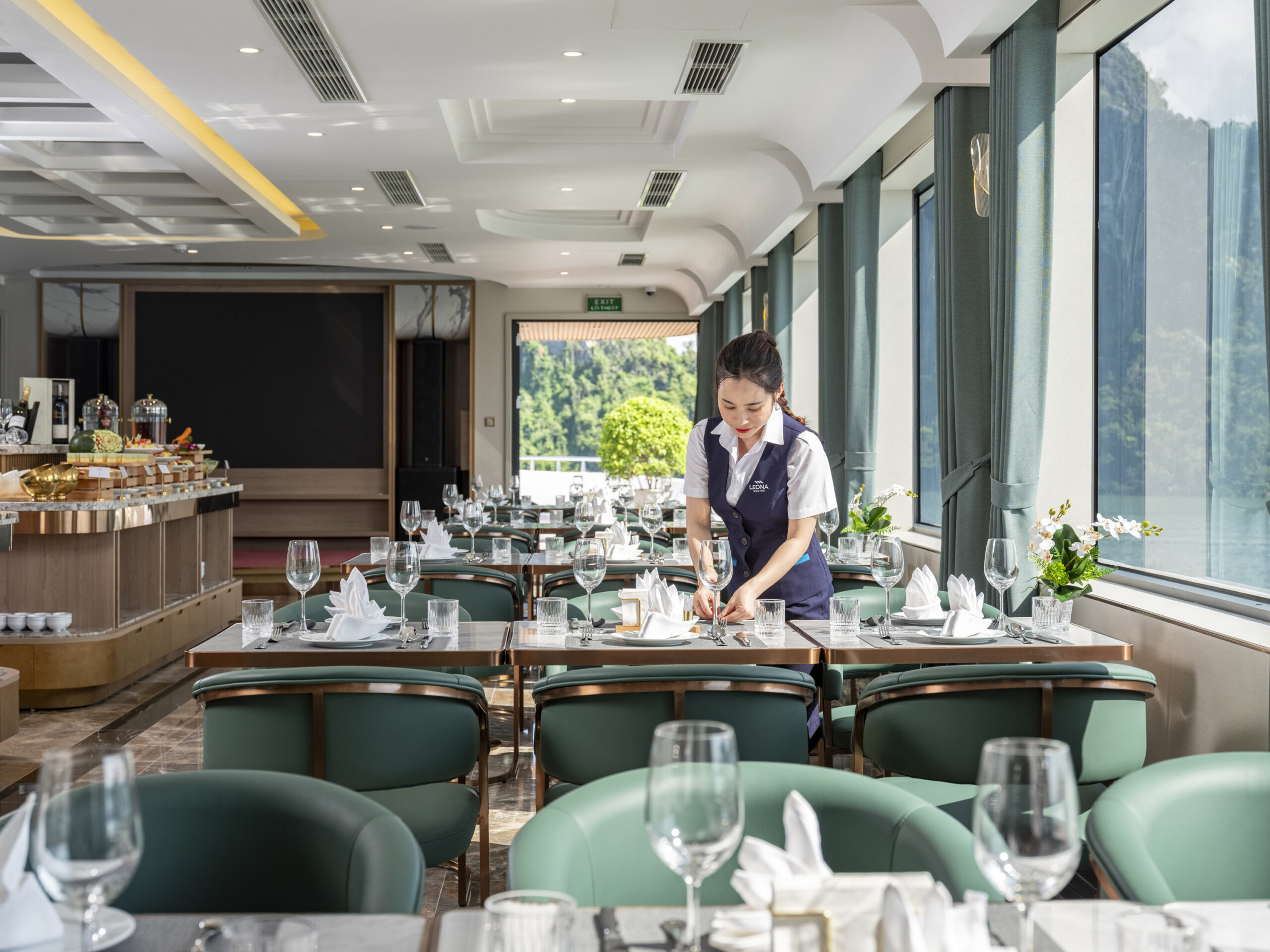 Đội ngũ hướng dẫn viên thông thạo nhiều ngôn ngữ, nhân viên phục vụ được đào tạo chuẩn quốc tế, luôn sẵn sàng hỗ trợ để hành trình của bạn trên Leona Cruise trở nên trọn vẹn, an toàn và đáng nhớ nhất.